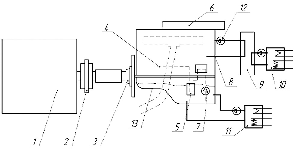 Fig. 3. The simplified scheme of the testing facility: 1 – a driving dynamometric machine; 2 – a torque sensor; 3 – a jointed shaft with an adapter flange; 4 – main oil distributing passage, oil and pressure gauge; 5 – an oil filter; 6 – an air intake system; 7 – an oil pump; 8 – a coolant liquid pressure and temperature gauge at the outlet; 9 – a heat exchanger; 10 – a coolant liquid conditioning unit; 11 – an oil conditioning unit; 12 – a water pump, a coolant liquid pressure and temperature gauge at the inlet; 13 – an oil pan.