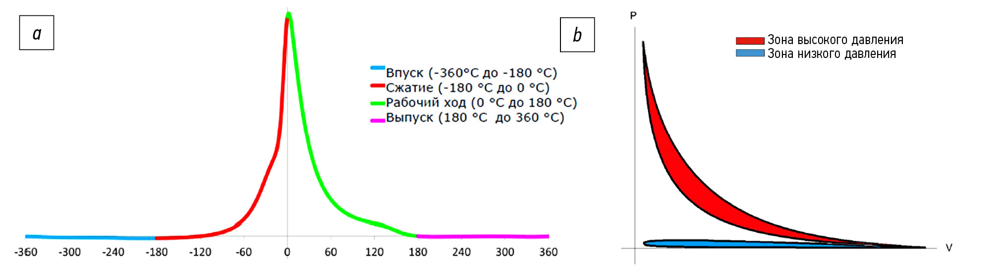 Рис. 4. Определение среднего индикаторного давления: a) калибровка индикаторной диаграммы; b) построение P-V диаграммы.