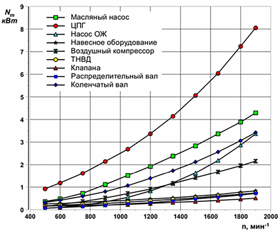 Рис. 6. График изменения мощности механических потерь основных групп компонентов от частоты вращения коленчатого вала.