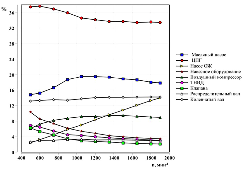 Рис. 7. График изменения процентной доли механических потерь основных групп компонентов от частоты вращения коленчатого вала.