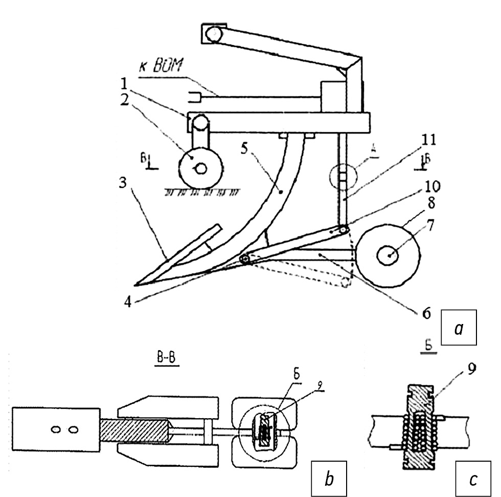 Краткий анализ литературных источников показывает следующее. У «Устройства для безотвальной обработки почвы» [5] рабочий орган представляет собой стойку с загнутым концом, на котором установлено долото, а к задней части стойки крепится лапа. Для лучшего качества выполнения работы долото имеет заточку, а с целью увеличения ресурса его использования – напайку из металлокерамического сплава. Долота представляют собой эллиптические пластины, установленные на косом срезе загнутого конца стойки. Лапа выполнена полукруглой формы, имеет верхнюю заточку, а в торце задней части изготовлены ворошители. «Устройство для безотвальной обработки почвы» [6], рабочими органами которого являются стойки с ножами, установленными с возможностью вращения. Ножи представляют собой плоские диски с заточенной кромкой и съемными разнообразной формы лопастями. Для улучшения качественных показателей обработки почвы лопасти снабжены ворошителями в виде кусков цепи. «Устройство для щелевания» [7] основой, которого является рама с установленным на ней брусом, представляющим собой две параллельные пластины, установленные жестко и имеющие трапецеидальную форму. В образованный пластинами паз установлена пластинчатая стойка, на которой расположен нож в виде чизельной лапы. К ножу с тыльной стороны крепится кротователь, имеющий цилиндрическую торпедообразную форму. Стойка, благодаря параллелограммному механизму и кинематической связи посредством шестерен со штоком, имеет возможность вращения посредством силового гидроцилиндра. «Орудие для противоэрозионного щелевания почвы» [8] включает в себя раму с установленными на ней последовательно ножом-щелерезом и рабочим органом для поделки канальцев в прищелевых валиках, имеющим механизм привода, рабочий орган которого выполнен в виде лопатки изогнутой формы. Выпуклость лопатки направлена в сторону, противоположную направлению движения. Лопатка закреплена на раме шарнирно с возможностью колебаний в поперечной плоскости относительно направления движения. Механизм привода рабочего органа является кривошипно-рычажным.