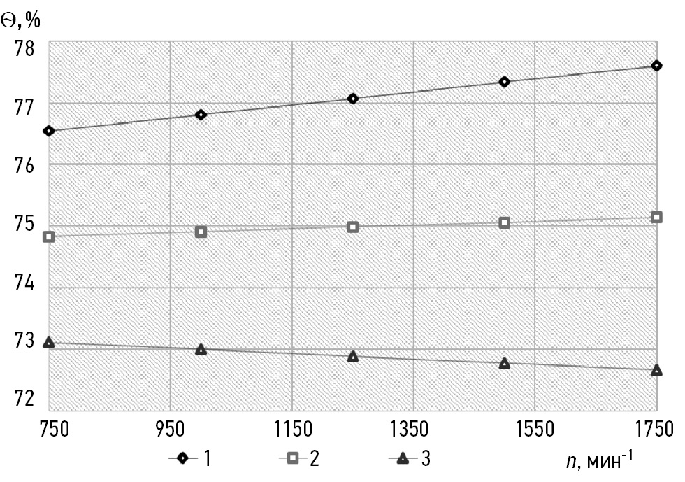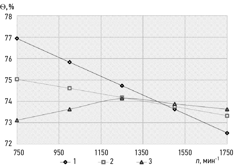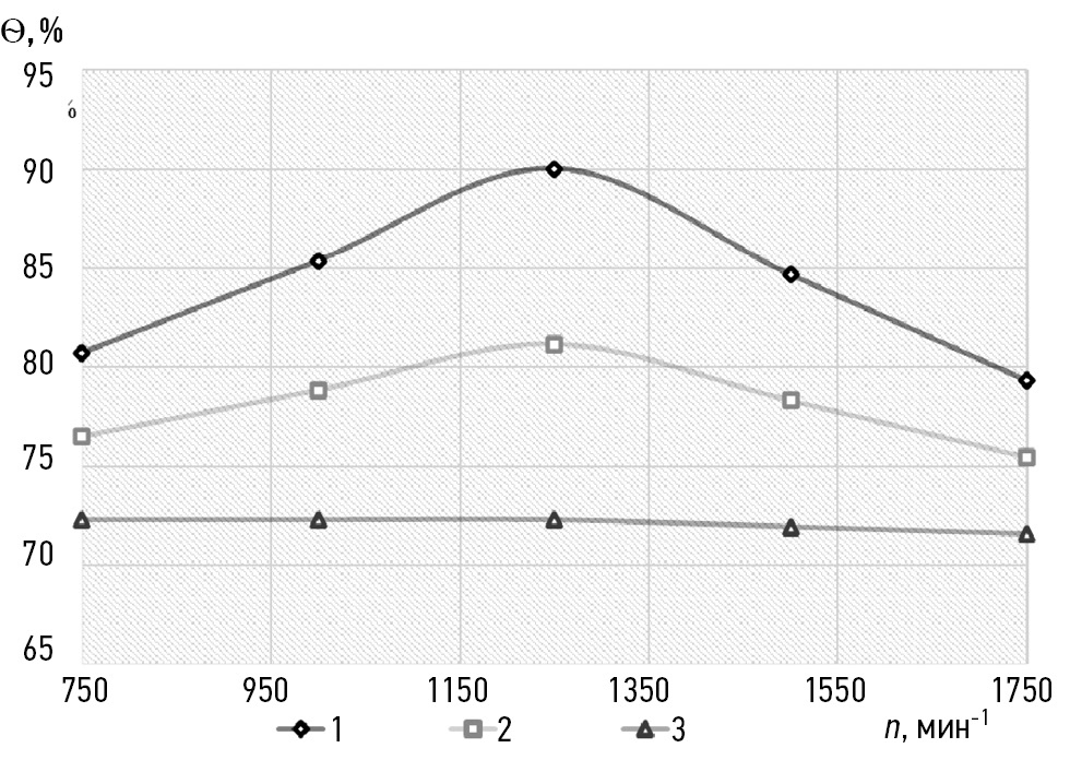 Рис. 3. График зависимости степени однородности Ѳ, %, при различной частоте вращения n, мин-1 рабочего колеса, при разных температурах воды t, °С (Z = 24 шт.): 1 – температура t = 20 °C; 2 – температура t = 30 °C; 3 – температура t = 40 °C.