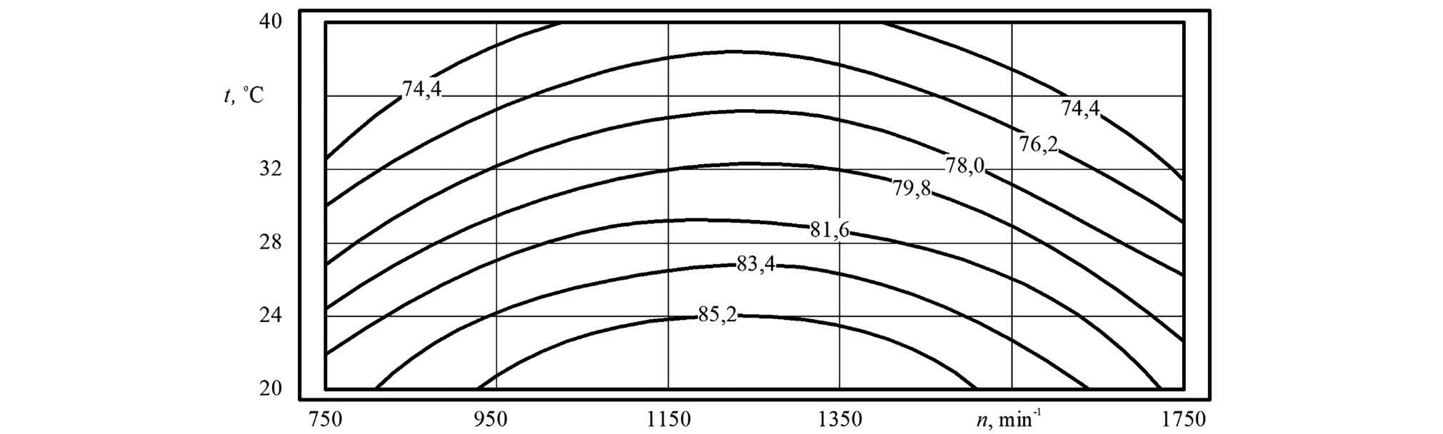 Рис. 4. Двумерное сечение поверхности отклика степени однородности Ѳ, %, в зависимости от частоты вращения n, мин-1 и температуры воды t, °C.