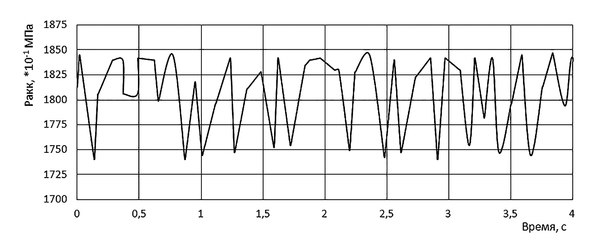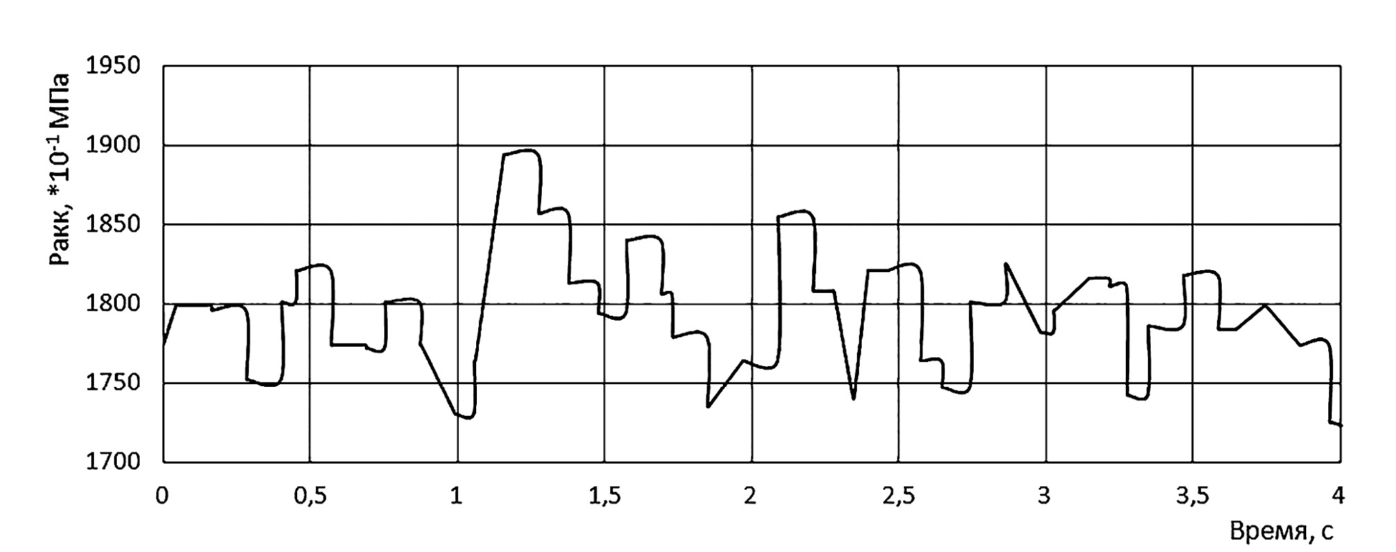 Из рис. 2 видно, что размах колебаний давления в топливном аккумуляторе достигает 10 МПа, график равномерный. На основании чего можем сделать вывод о возможности оптимизации конструкции ТНВД с целью снижения пульсаций давления в аккумуляторе и, впоследствии, повышении точности цикловой подачи форсунки.