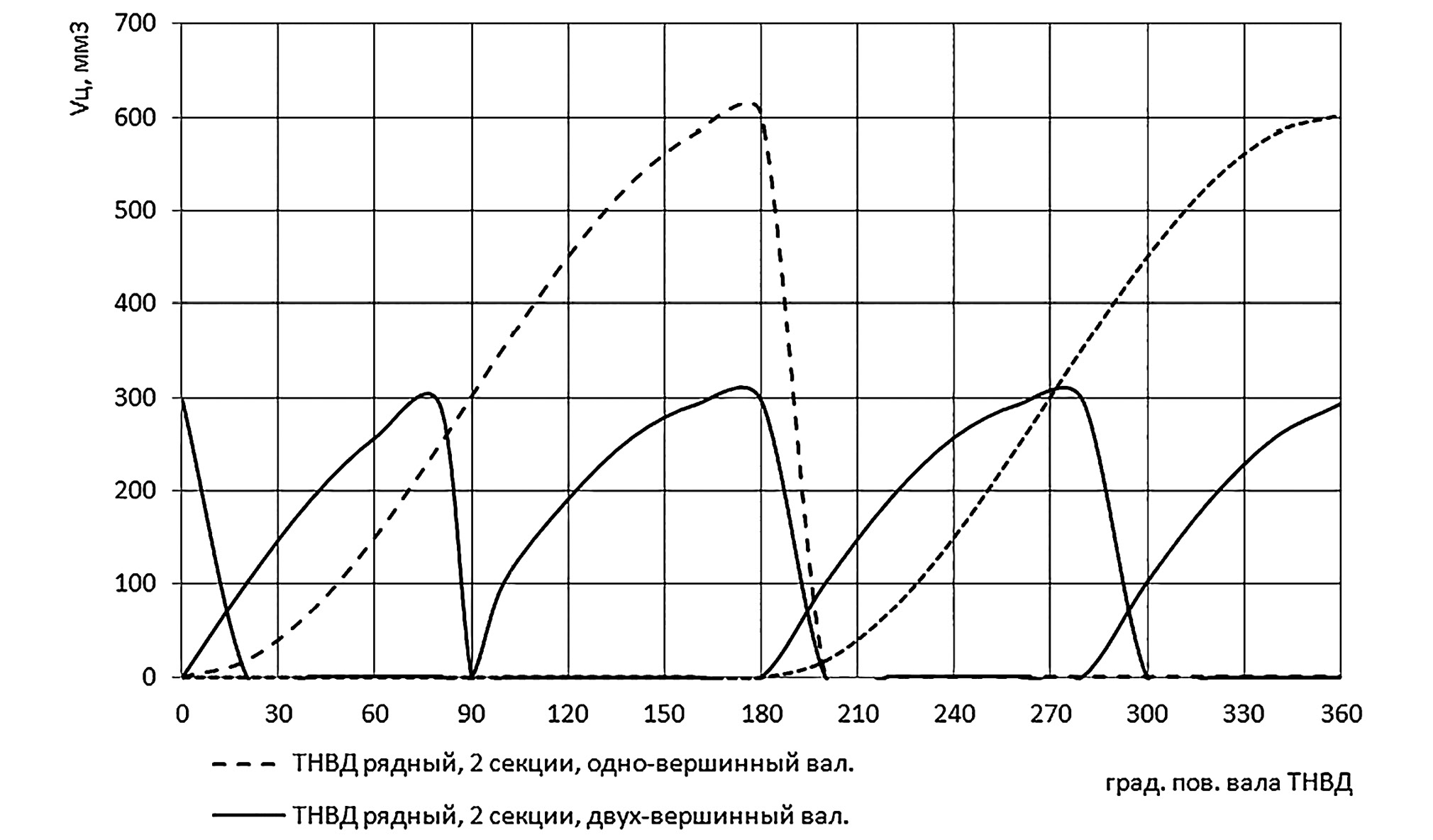 Рис. 3. График мгновенной производительности секций насосных рядных 2-х секционных ТНВД с одно- и двухвершинными валами.