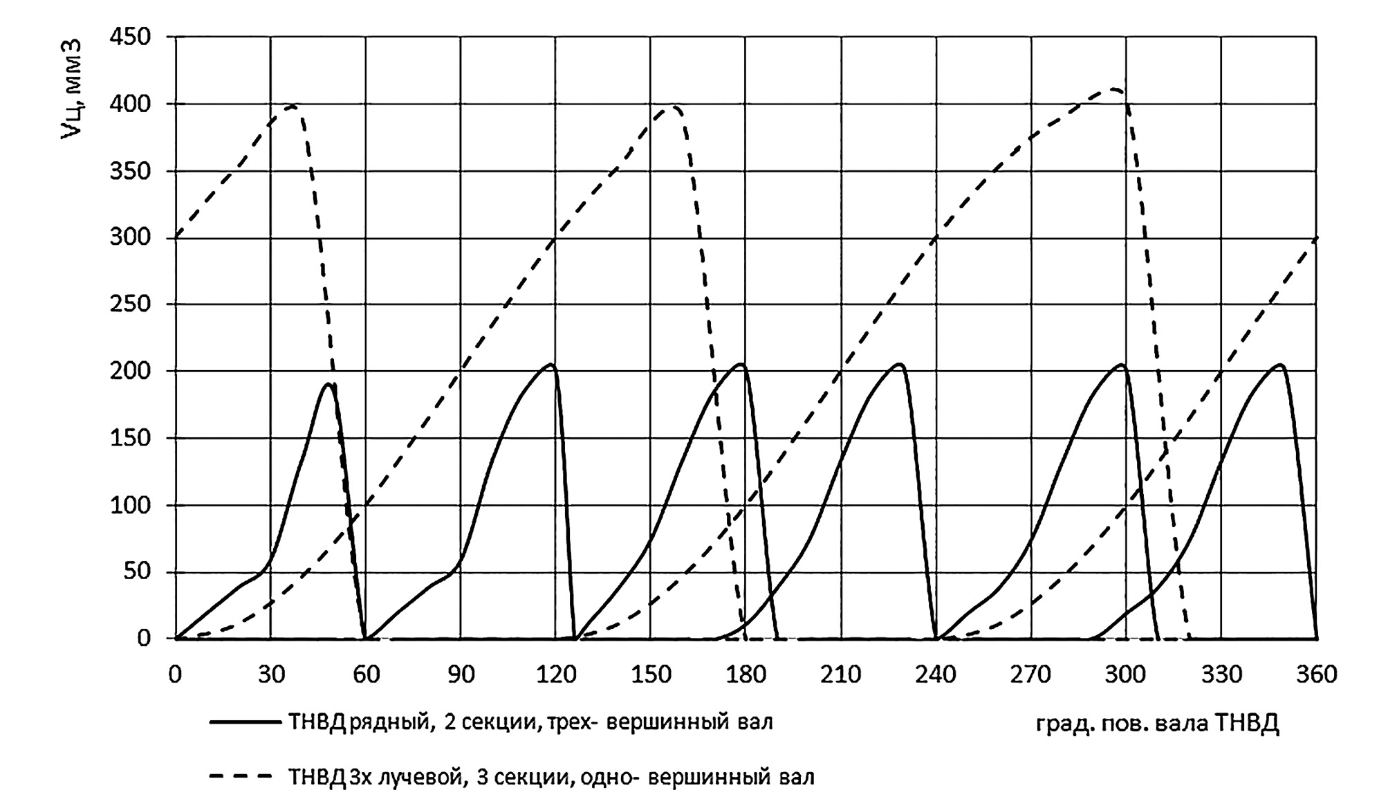 Рис. 4. График мгновенной производительности секций насосных 3-х лучевого ТНВД и рядного 2-х секционного насоса с трех вершинным валом.