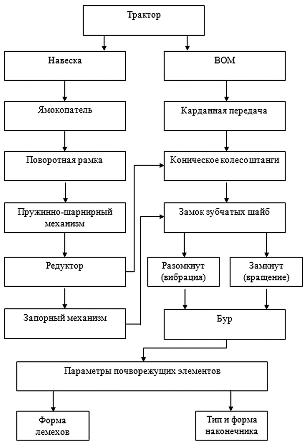 Для обоснования параметров рабочих органов ямобура поворотного виноградникового с техническими решениями [12], обеспечивающими возможность работы на плотных почвах, разработана принципиальная структурно-функциональная схема, представленная на рис. 1.