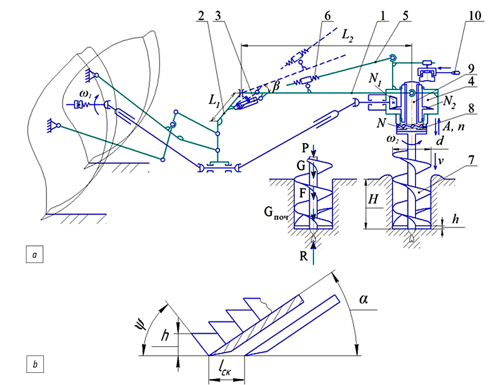 На схеме (рис. 2) обозначены: R − сопротивление заглублению бура в почву; G − сила тяжести; F − вертикальная проекция силы трения почвы о стенку ямы; Gпоч − сила тяжести почвы, находящейся на поверхности бура во время его работы; P − вибрационная сила; Н – глубина ямы; d – диаметр бура; h – глубина врезания лемехов бура в почву за оборот, v – скорость заглубления бура; A, n – соответственно амплитуда и частота вибрации бура; N – количество зубцов на шайбах; N1, N2 – соответственно количество зубьев ведущей и ведомой шестерен конического редуктора бура; ω1, ω2 – соответственно угловая скорость вращения ВОМ трактора и вала бура; L1, L2, β – конструктивные параметры поворотной рамки бура.