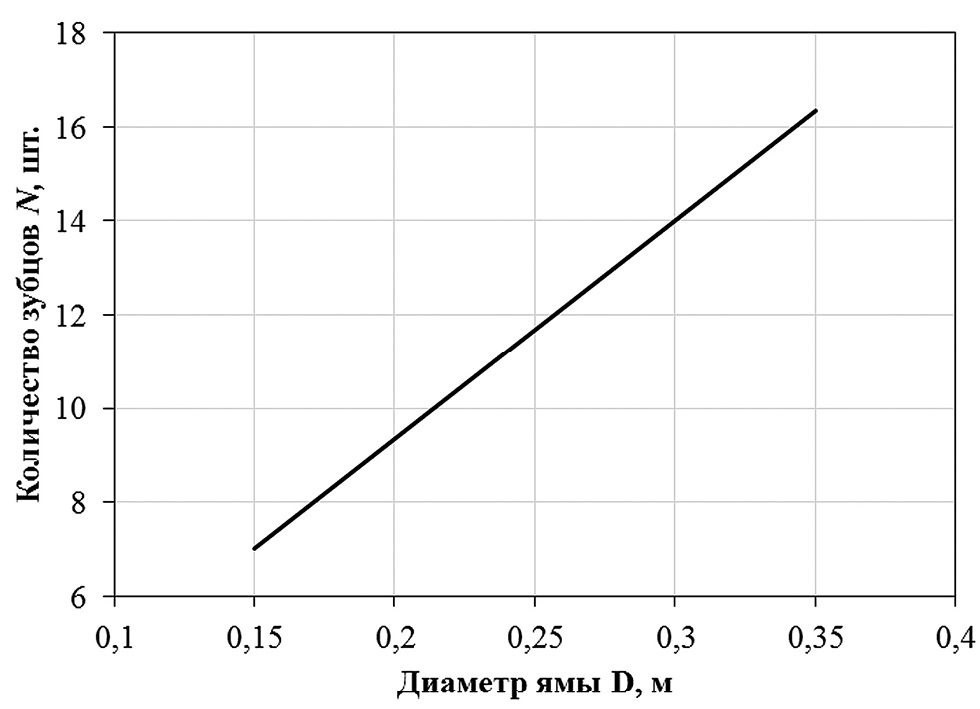 По результатам расчётов построена зависимость, представленная на рис. 3, количества зубцов N на шайбах вибропривода от диаметра бура d (диаметра ямы D, м).