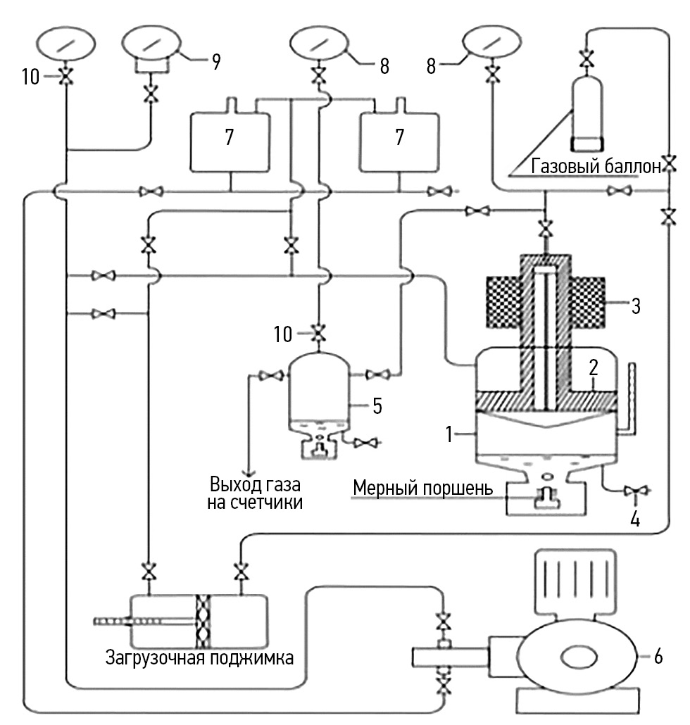 Рис. 1. Схема установки УГК-3 для исследования коэффициента сжимаемости биогазового топлива: 1 – бомба равновесия; 2 – разделительный поршень; 3 – магнитная катушка; 4 – вентиль загрузки углекислого газа; 5 – термостатируемый сепаратор; 6 – плунжерный насос; 7 – бочки для жидкости; 8 – манометры пружинные; 9 – манометр ЭКМ; 10 – вентили запорные.