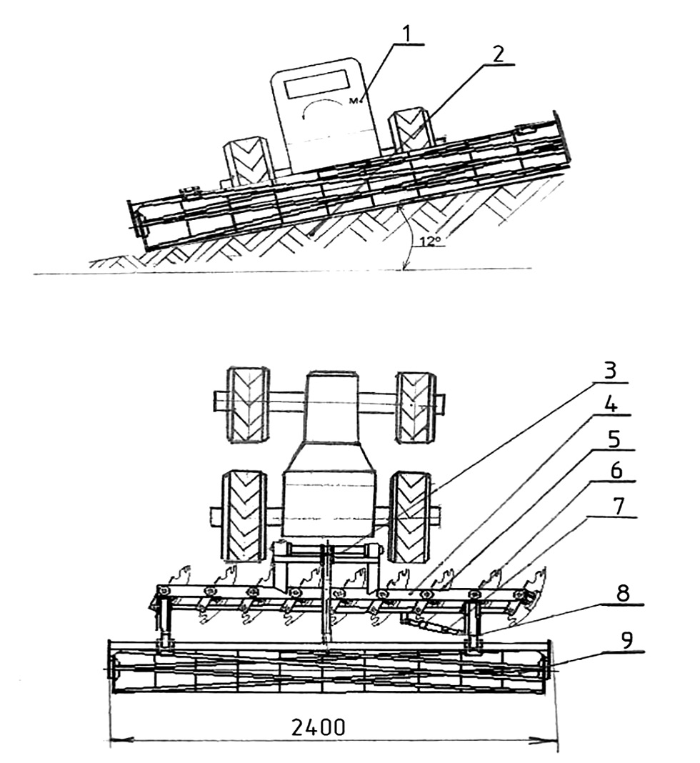 Рис. 1. Принципиальная схема горного минидискатора: 1 – минитрактор; 2 – почва; 3 – навеска агрегата; 4 – рама минидискатора; 5 – диск; 6 – соединение диска с рамой; 7 – гидроцилиндр; 8 – кронштейн прикатывающего устройства; 9 – прикатывающее устройство.