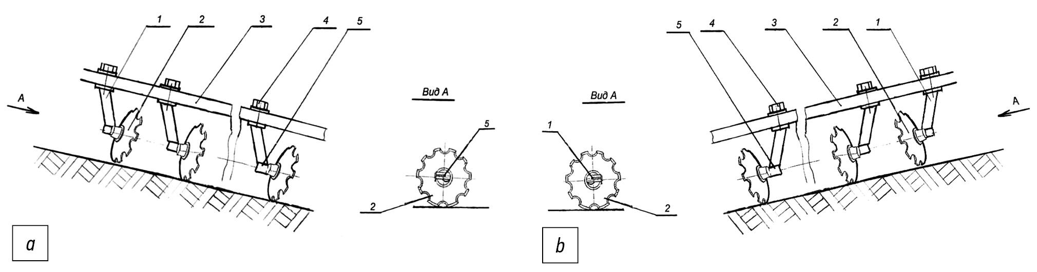 Установка рабочих органов (дисков) предусматривает возможность их разворота на 180 ° при переходе обработки правого склона к левому по ходу движения агрегата. Положение рабочих органов минидискатора изображено на рис. 2: а – на склоне 12 ° при движении справа-налево; b – на склоне слева-направо. Рабочие органы переводятся из положения правосклонного в левосклонное направление с помощью специального реечного механизма, расположенного внутри профильной трубы рамы (рис. 2). (Реечное устройство авторы планируют запатентовать, поэтому подробное описание не приводится.)