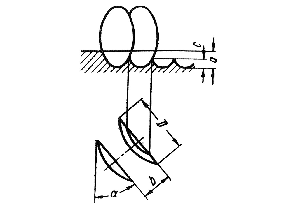 Угол α (угол атаки) – угол между плоскостью вращения диска и линией направления движения. Угол атаки может изменяться от 0 до 21 ° в зависимости от вида почвы и рельефных особенностей участка [13]. Известно, что отдельное самостоятельное крепление каждого диска позволяет более качественно бороться с сорняками, перемешивая грунт с растительными остатками. Между значением диаметра диска D, глубиной его обработки а, расстоянием между соседними дисками b и высотой гребня с существует следующая зависимость (рис. 3).