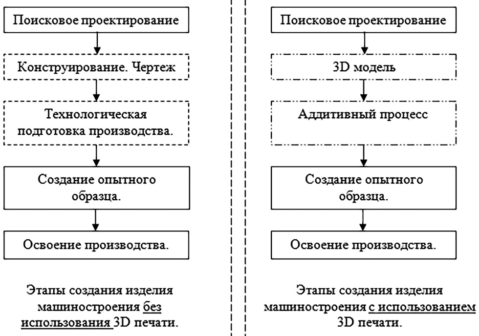 Этапы создания новых изделий имеют отличия при применении традиционной и аддитивной технологий. Данные этапы представлены на рис. 1 [1].