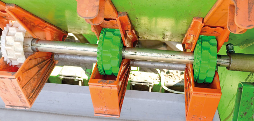 На рис. 8 и 9 показана установленная высевающая катушка, изготовленная с помощью технологии 3D-печати. Испытываемые катушки, которые были установлены на сеялку СС–11, имеют зеленый цвет. В результате настройки сеялки на норму высева 200 кг/га было установлено, что один высевающей аппарат должен высевать 180 г на 100 м2. Замеры, навесок полученных семян показали, что отклонение нормы высева катушки, изготовленной при помощи 3D-печати, от оригинальной не превышает допустимых пределов ±5% и составила 10–20 гр.