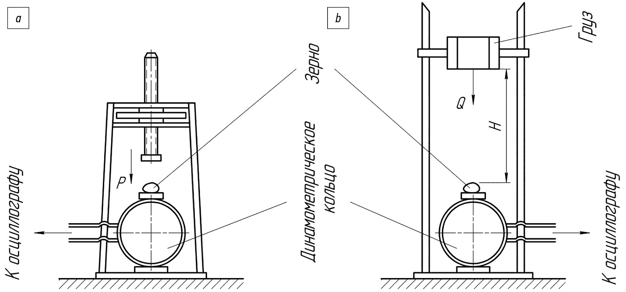 Рис. 1. Схема прибора для определения усилия разрушения зерна: а – при статической нагрузке, b – при ударной нагрузке.