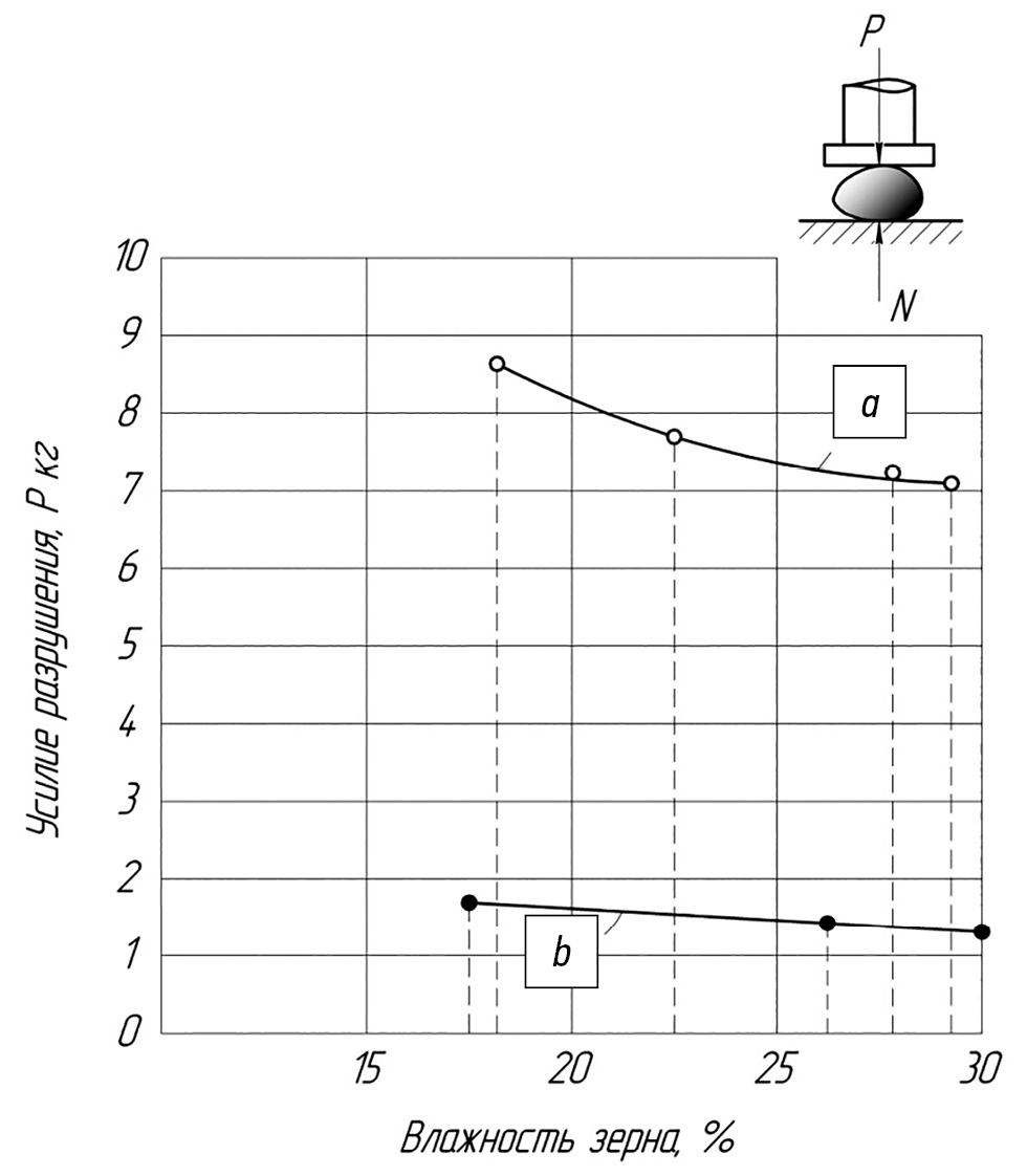 Для определения усилия, разрушающего зерно, при статической нагрузке, зерно сдавливалось по ширине на специальном винтовом прессе, где оно располагалось на наковальне динамометрического кольца с проволочными датчиками. При постепенном опускании винта зерно разрушалось [5].