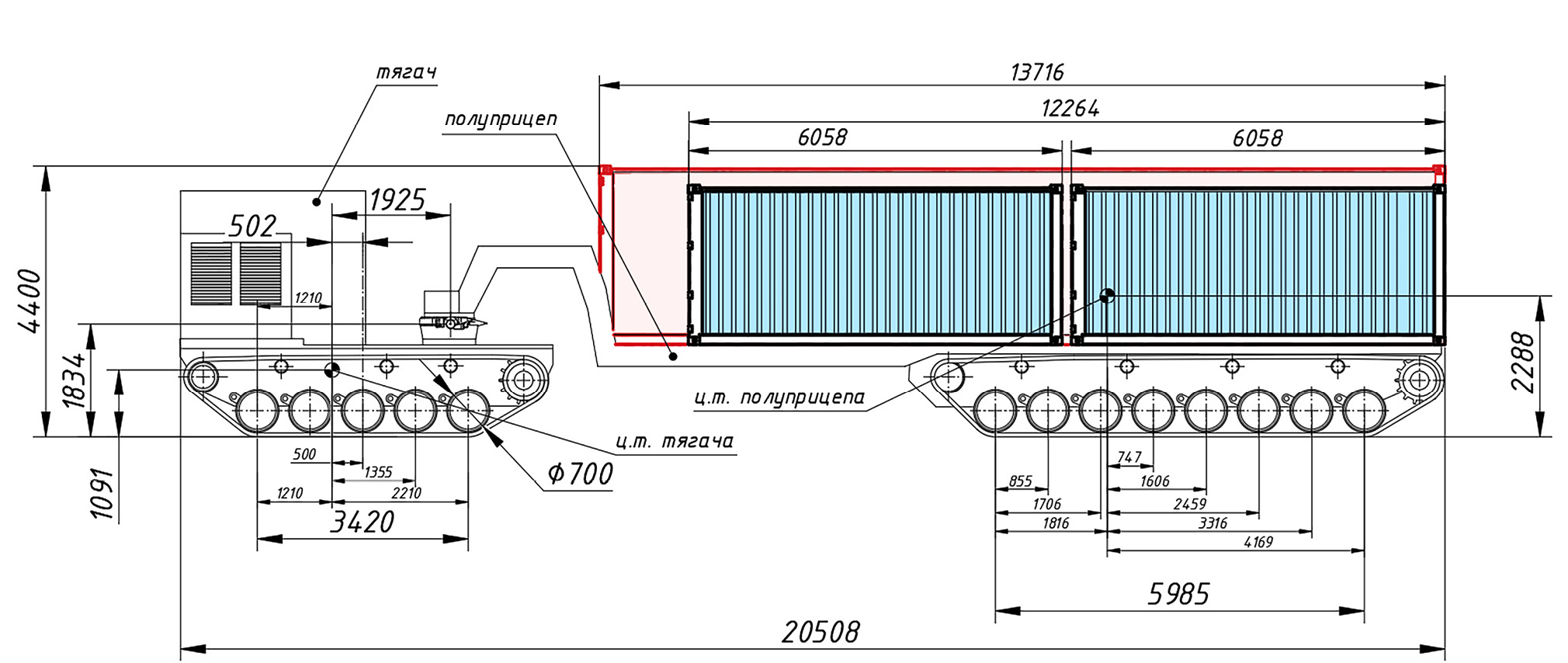 Рис. 1. Конструктивно-компоновочная схема беспилотного гусеничного поезда, выполненного по седельной одношарнирной схеме полной массой 106 тонн.