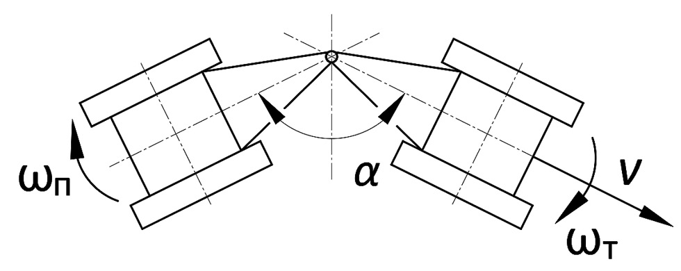 Таким образом, для обеспечения складывания звеньев, как показано на рис. 2, необходимо, чтобы угловая скорость поворота тягача была больше угловой скорости поворота полуприцепа.