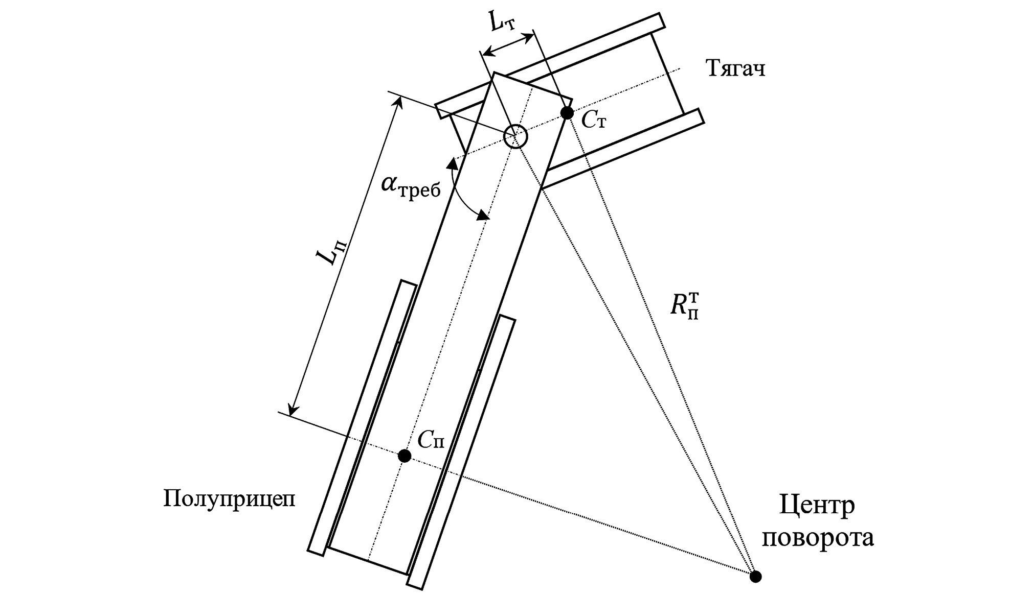 Рассмотрим расчетную схему установившегося поворота ГП, представленную на рис. 4. Теоретическая кривизна траектории может определяться углом . При этом управление тягой полуприцепного звена не должно препятствовать повороту ГП, равно как и приводить к чрезмерному «складыванию» при малых радиусах поворота.