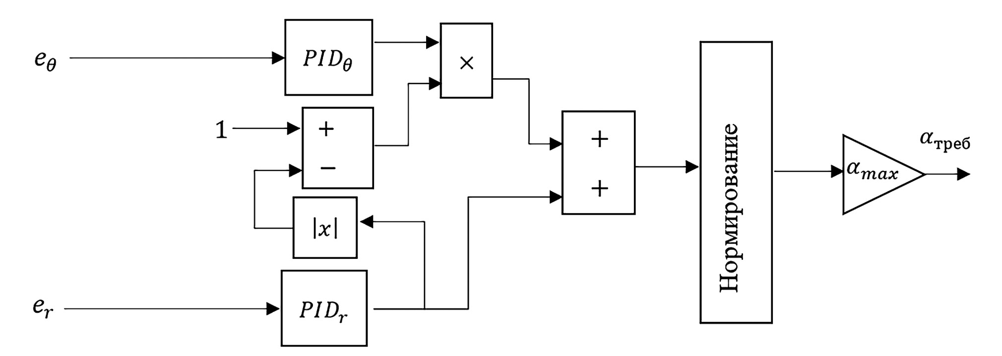 В случае движения полуприцепного ГП компенсация отклонения от траектории движения по расстоянию и углу обеспечивается поворотом тягача на требуемый угол. Для полуприцепного ГП предлагается ввести следующий алгоритм работы системы: в первую очередь устраняется линейное отклонение, а затем – угловое. В соответствии с указанными требованиями разработан регулятор управления движением полуприцепного ГП, структурная схема которого представлена на рис. 10.