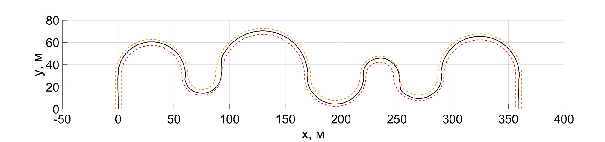 Для оценки эффективности разработанных законов движения ГП с активным полуприцепным звеном в двух вариантах (с возможностью независимого управления приводом ведущих колес и с дифференциальной связью ведущих колес ведущих колес) по маршруту типа «змейка» переменной кривизны [17]. Эффективность разработанных законов управления будем оценивать по максимальным траекторным и курсовым ошибкам и их среднему значению и за время движения по заданному маршруту и энергоэффективности – по величине затраченной энергии ГП за время прохождения маршрута. Допустимая ширина коридора для точки (рис. 9) принята равной 7 м (рис. 12). При маневрировании поддерживается низкая скорость движения 5 км/ч. При проведении сравнительной оценки различных вариантов ГП прямолинейные участки маршрута были ограничены длиной 30 м. На рис. 12 в качестве примера представлена траектория движения точки для ГП с независимым управлением приводом ведущих колес полуприцепного звена и допустимый коридор движения точки .