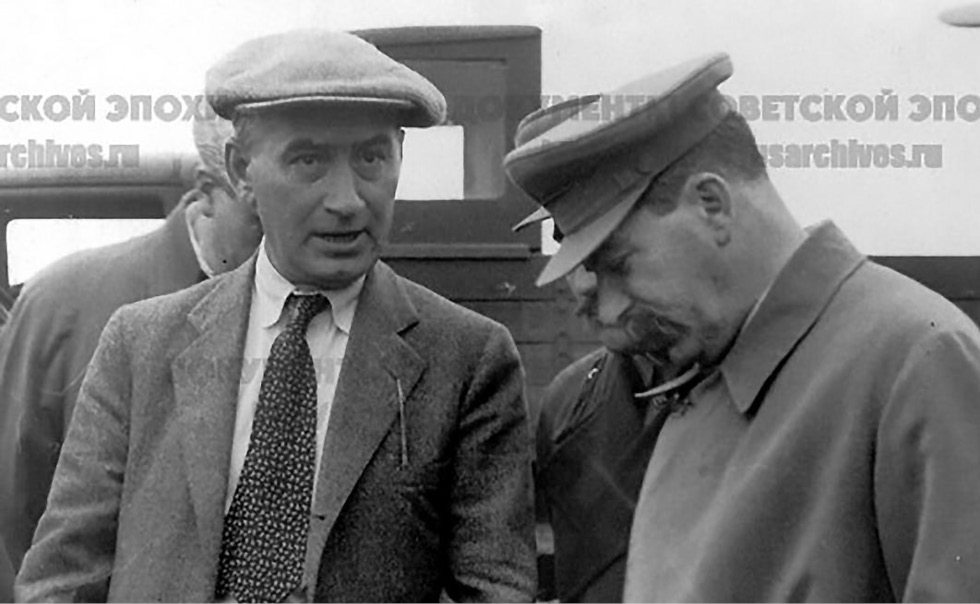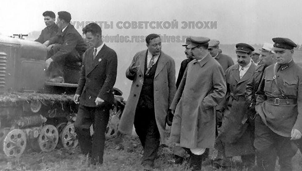 Рис. 6. Демонстрация гусеничных тракторов руководству СССР 16.07.1935 в Лихоборах. Рядом с трактором СТЗ-3 идет инженер-испытатель СТЗ А.М. Левандовский; пояснения И.В. Сталину дает директор СТЗ В.В. Фокин; справа от Г.К. Орджоникидзе (в белой фуражке) технический директор СТЗ Э.А. Сатель.