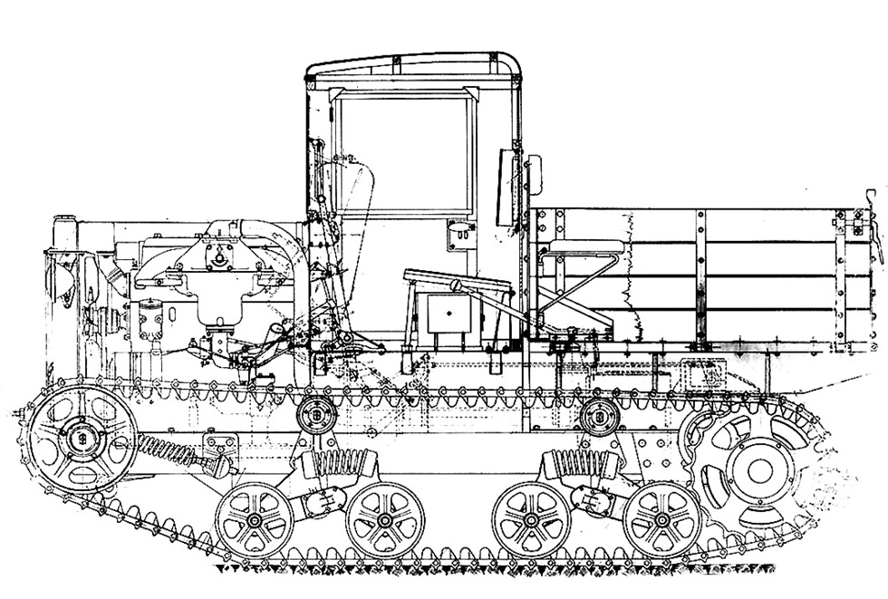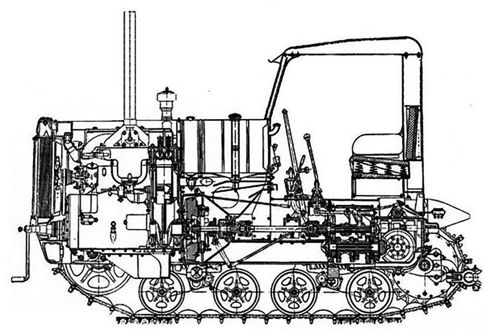 - топливные (керосиновый емкостью 170 л, бензиновый емкостью 9 л) и водяной емкостью 55 л баки конструкторы расположили между двигателем и кабиной; это, в частности, обеспечило практически оптимальное положение центра масс трактора (чего, кстати, не удавалось долгое время добиться на тракторах СТЗ/ВгТЗ более поздних конструкций: ДТ-54, ДТ-75 и др.): он был смещен вперед, в статике на передние каретки подвески приходилось 58% веса трактора, на задние – 42%; в результате при работе с крюковой нагрузкой центр давления смещался к середине опорной поверхности, нагрузка по каткам распределялась равномернее, что обеспечивало получение высокого тягового КПД.
