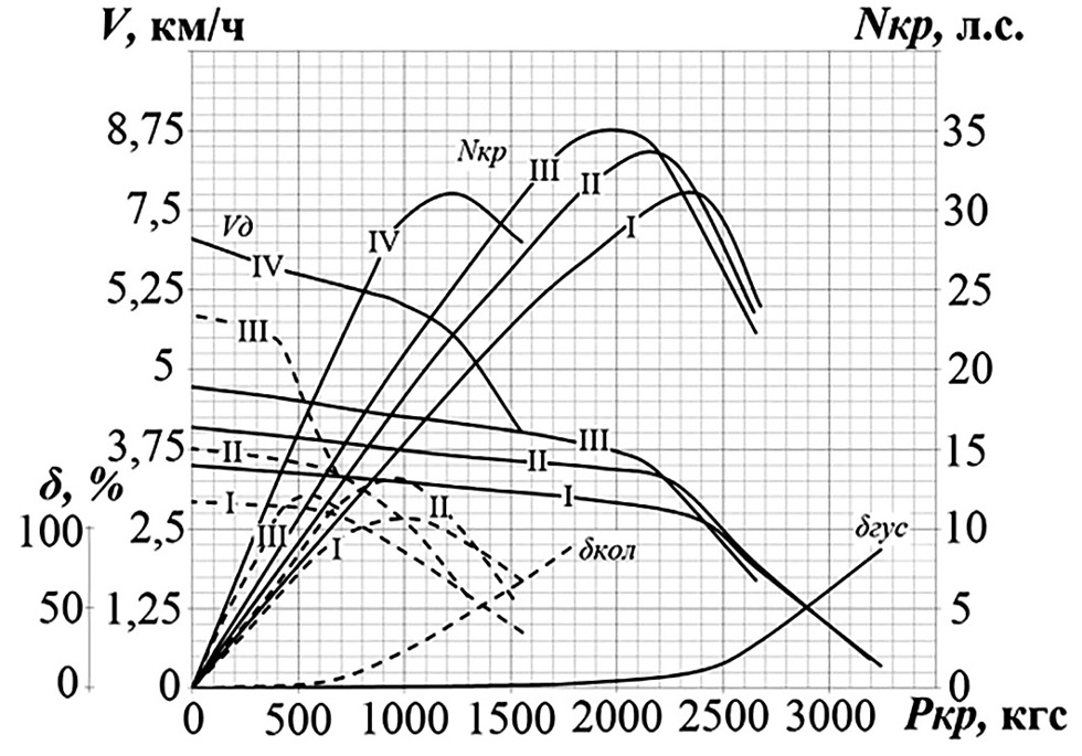 Рис. 11. Тяговые характеристики тракторов: гусеничного СТЗ-НАТИ (сплошные линии) и колесного СТЗ-1 (пунктирные линии). Почвенный фон – поле, подготовленное к посеву.