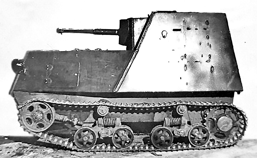 - гусеницы с легкими литыми 5-проушинными звеньями, с открытыми металлическими шарнирами (плавающие пальцы с осевой фиксацией проволочными штифтами с обеих сторон), с цевочным тянущим зацеплением с ведущим колесом; верхняя ветвь каждой гусеничной цепи поддерживалась 2-мя роликами;