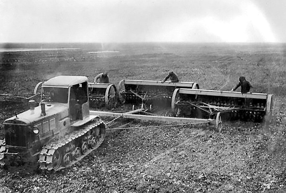 СТЗ и ХТЗ изготавливали эту машину в 1937–1949 гг. (с перерывом во время ВОВ в 1941–1944 гг.), АТЗ – в 1942–1952 гг. Всего тремя заводами было выпущено 191000 (по другим данным 210744) тракторов АСХТЗ-НАТИ. До появления и распространения ДТ-54 это был основной сельскохозяйственный пахотный трактор в СССР. Он использовался в сельском хозяйстве в агрегате с различными орудиями и машинами на широком спектре работ (рис. 19–21), часто применялся на транспортных работах, особенно в весеннюю, осеннюю распутицу и зимой, был востребован в различных других отраслях народного хозяйства, пользовался заслуженным уважением механизаторов.