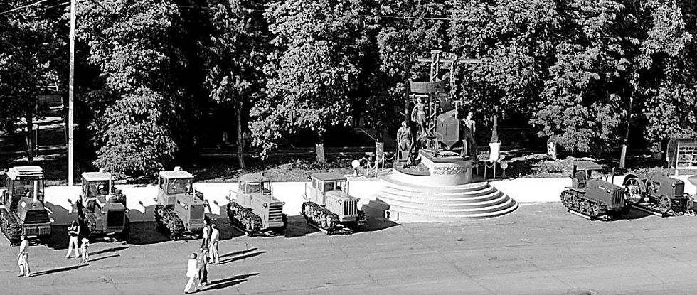 Рис. 22. СТЗ-НАТИ (второй справа) в экспозиции выпускавшихся тракторов на внутризаводской площади ВгТЗ у памятника тракторостроителям всех поколений (снимок 2010 года).