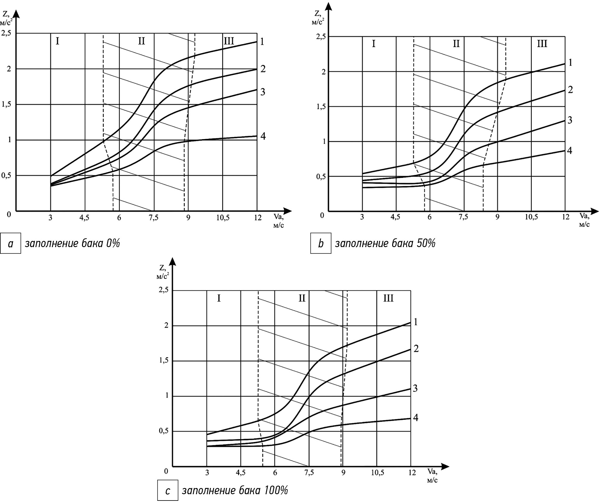 Рис. 2. Максимальное вертикальное ускорение МЭС-600на оси колеса при заполнении бака: а – заполнение 0%; b – заполнение 50%; c – заполнение 100%; и давлении в шинах 1 – 80 кПа; 2 – 60 кПа; 3 – 40 кПа; 4 – 20 кПа.