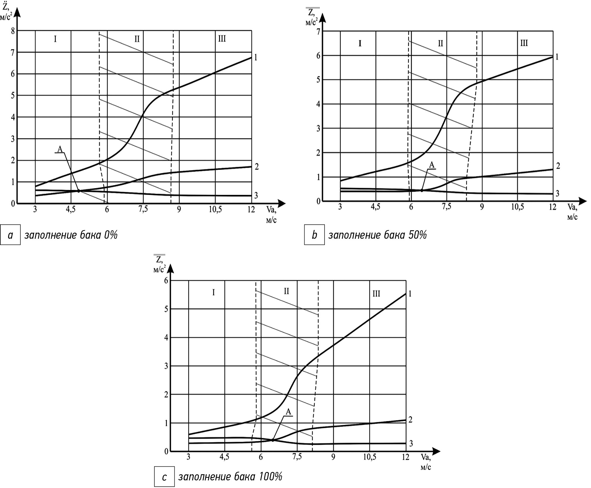 Результаты испытаний по оценке влияния давления воздуха в шинах и скорости движения МЭС на уровень ускорений на раме над осью колес при движении по искусственным неровностям и различной степени заправки бака технологической жидкостью приведены на рис. 3. Характеристики так же имеют ярко выраженные три характерных участка.