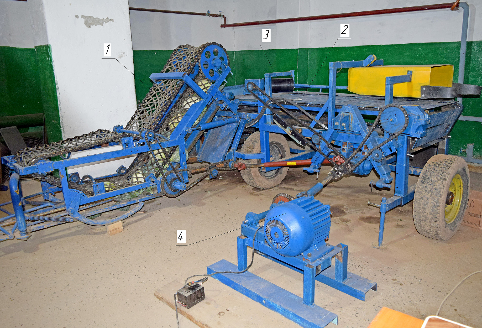 Лабораторная установка (рис. 2), состоящая из блоков режущего аппарата 1 и транспортер-обрезчика 2 с листоотделителем 3 подключалась к электроприводу 4 с частотой вращения вала 540 об/мин, равной частоте вращения вала отбора мощности агрегатирующего комбайн трактора в номинальном режиме работы его двигателя.