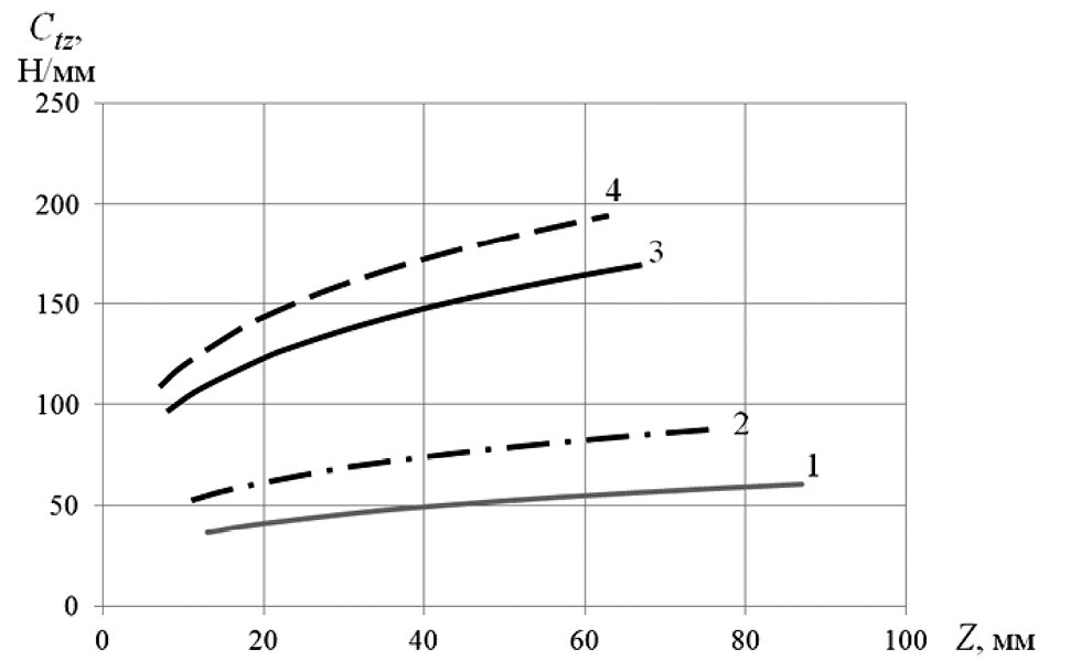 Рис. 3. Нормальная жесткость шины 1300х600-533: 1 – р =20 кПа; 2 – р =30 кПа; 3 – р =60 кПа; 4 – р =70 кПа.