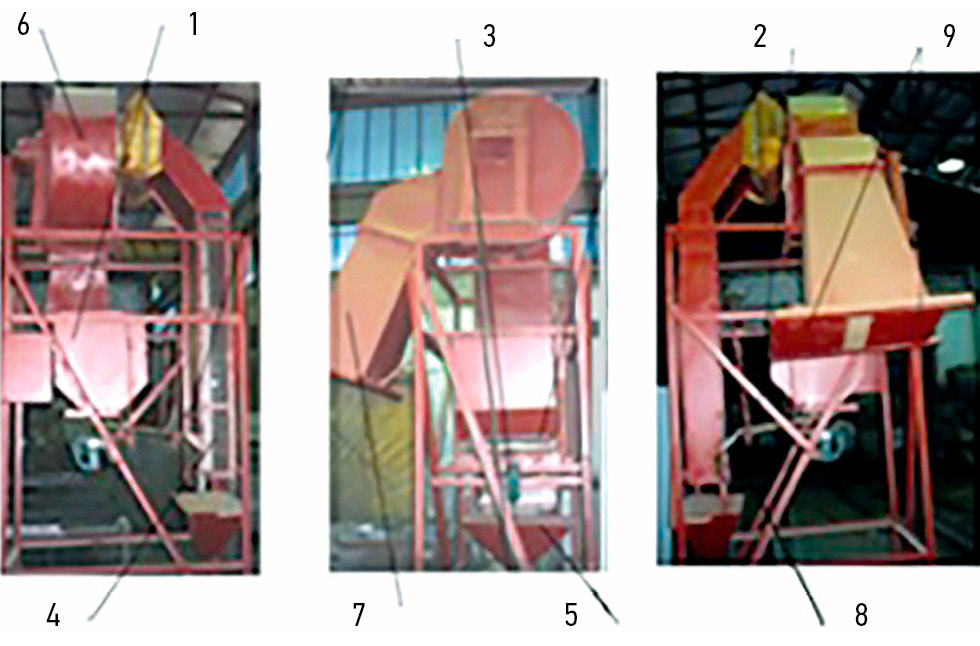 Рис. 1. Общий вид экспериментальной установки для определения скорости их ввода в вертикальный воздушный поток: 1 – бункер для семян; 2 – заслонка бункер семян; 3 – направитель из металла; 4 – приводное устройство; 5 – заслонка; 6 – пневматический канал; 7 – осадочная камера для семян; 8 – вентилятор; 9 – осадочная камера для примесей.