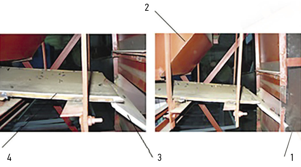 Fig. 2. Movement of the sunflower seeds on the feeding device surface: 1 – a vertical pneumatic channel; 2 – a tank; 3, 4 – feeding devices (guides) made of fluoropolymer and metal respectively.