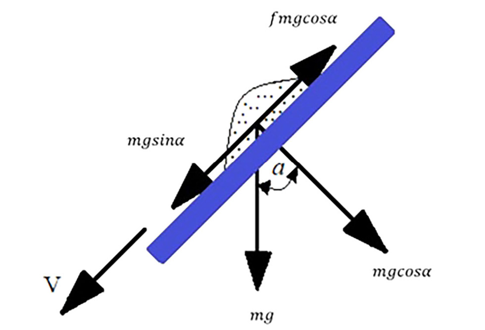 Анализ уравнения (7) показывает, что скорость перемещения вороха семян подсолнечника на поверхности подающего устройства зависит от угла его наклона.
