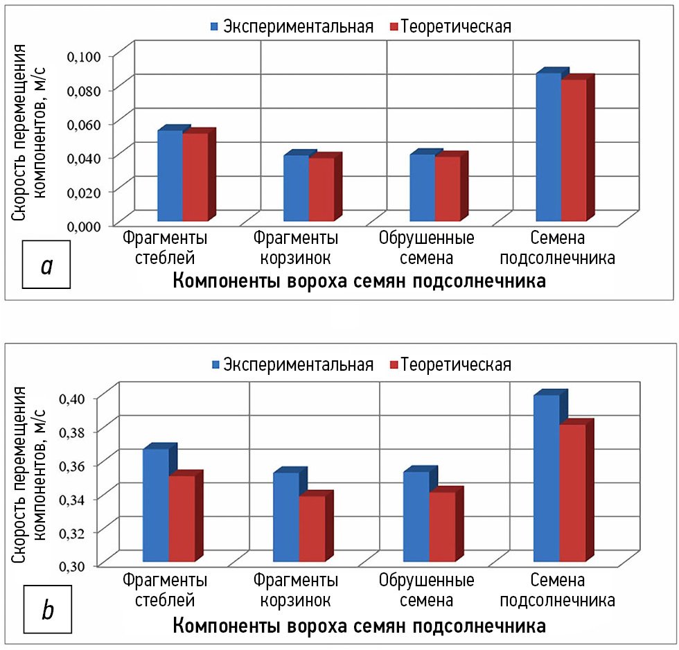 Рис. 4. Результаты определения скорости перемещения компонентов вороха семян подсолнечника с подающего устройства, изготовленного из: a – металла; b – фторопласта.