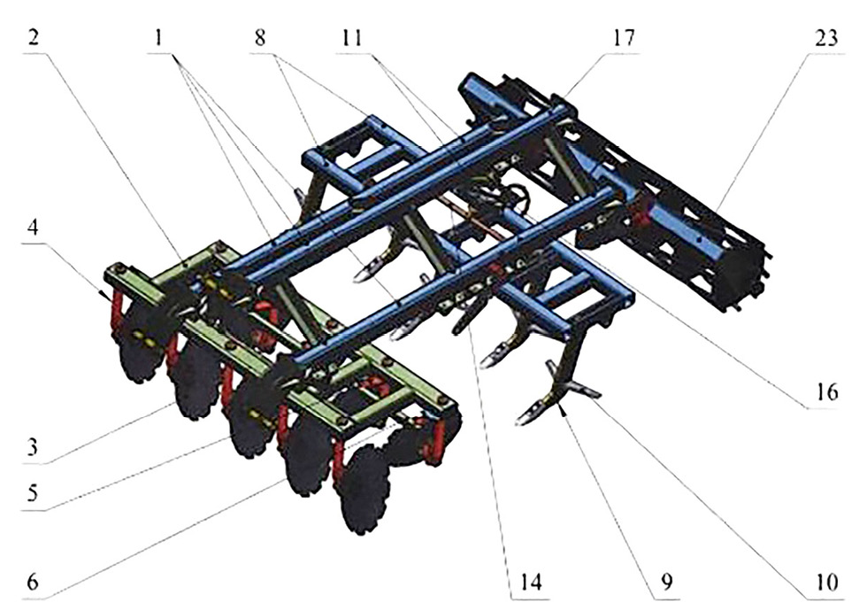 Рис. 1. Схема агрегата: 1 – рама продольная; 2 – рама дискового модуля; 3 –диск сферический; 4 –стойка индивидуальная; 5 – рычаг; 6 – планка; 8 – рама чизельного модуля; 9 – лапа-глубокорыхлитель; 10 –нож боковой; 11 – балка нижняя; 14 – ось; 16 –домкрат винтовой; 17 – балка верхняя; 23 – крепление. / Fig. 1. The unit’s layout: 1 – a longitudinal frame, 2 – a disk module frame; 3 – a spherical disk; 4 – an individual strut; 5 – a lever; 6 – a rack; 8 – a chisel module frame; 9 – a deep tiller; 10 – a lateral knife; 11 – a lower beam; 14 – an axle; 16 – a screw-jack; 17 – an upper beam; 23 – a mounting.
