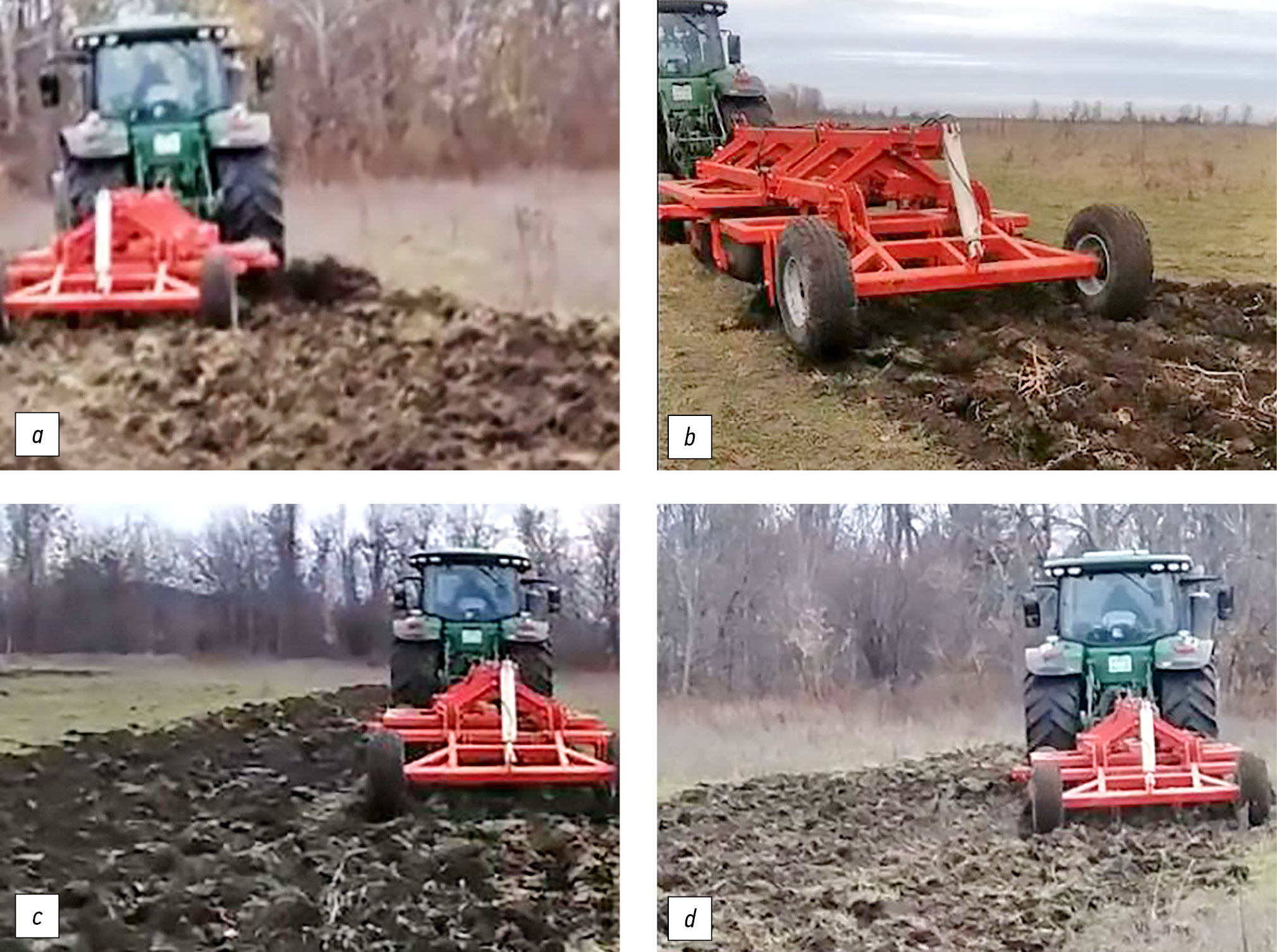 Рис. 3. Диско-чизельная борона при работе с разными углами атаки дисков: a) – 45°; b) – 30°; c) – 15°; d) – 5°. / Fig. 3. The disk-chisel harrow at operation with various disk attack angles: a – 45°; b – 30°; c – 15°; d – 5°.