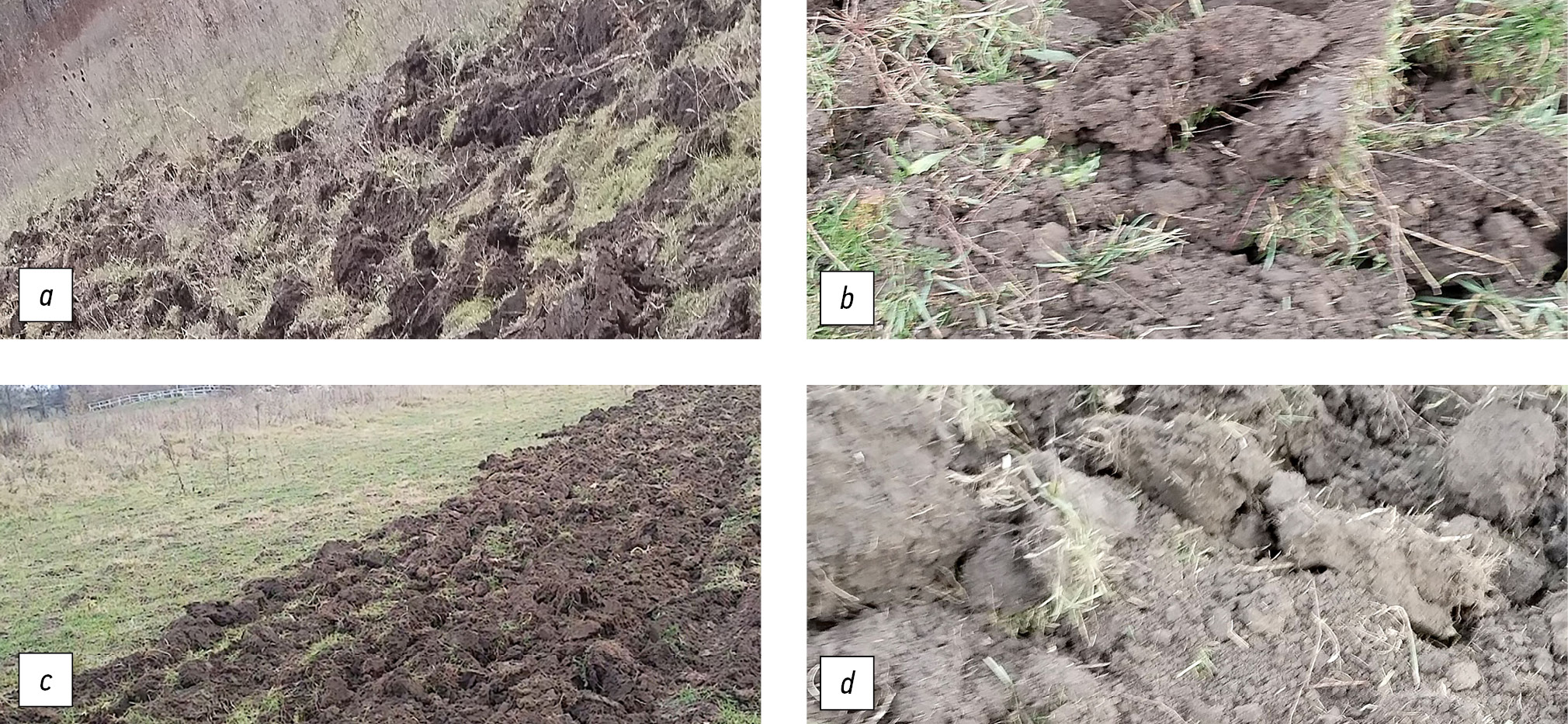 Рис. 4. Внешний вид почвы, обработанной под разными углами атаки дисков: a) угол атаки 5°; b) угол атаки 15°; c) угол атаки 30°; d) угол атаки 45°. / Fig. 4. Appearance of the soil cultivated with various disk attack angles: a) the attack angle 5°; b) the attack angle 15°; c) the attack angle 30°; d) the attack angle 45°.