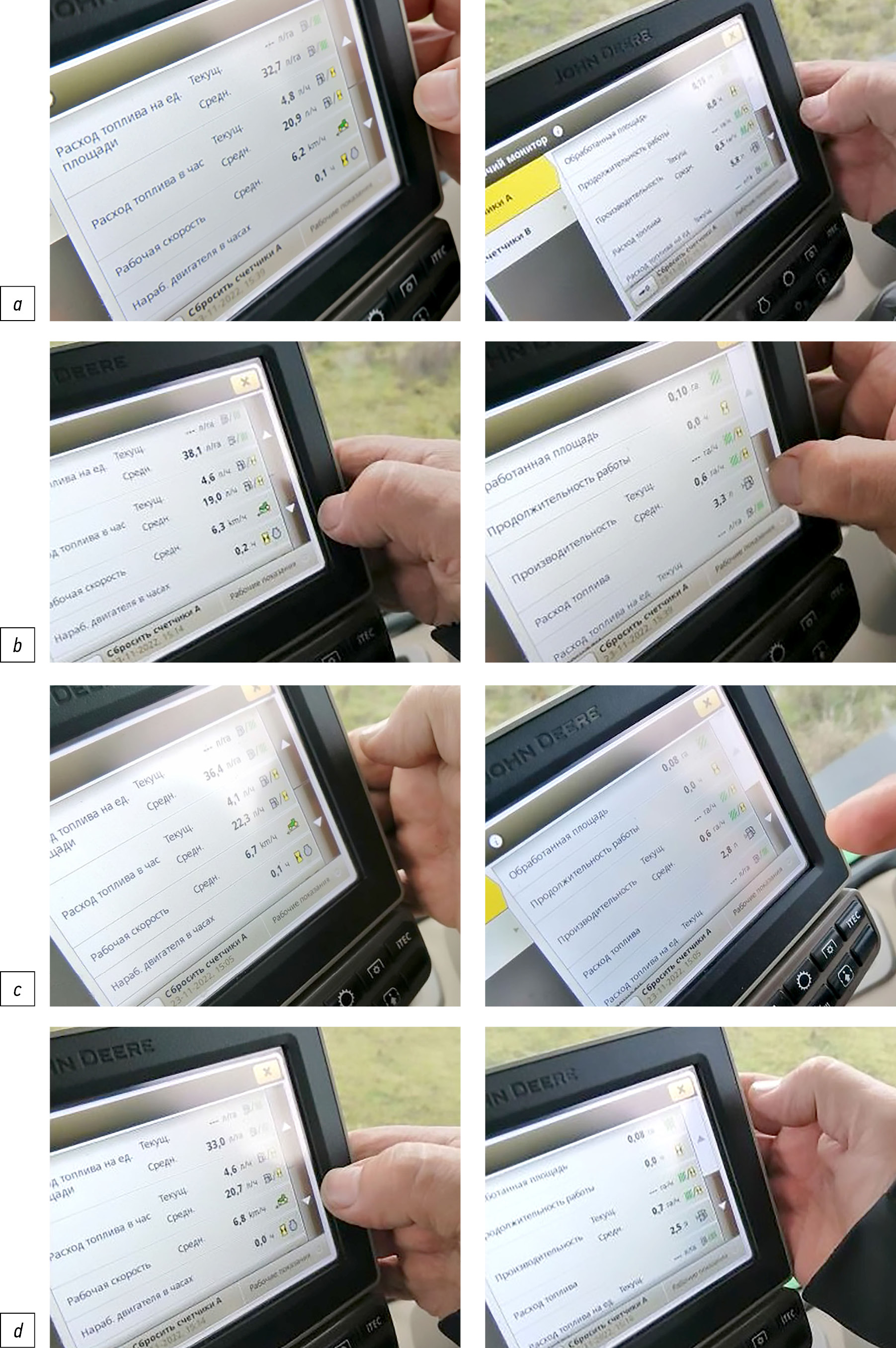 Рис. 5. Показания системы Глонасс на тракторе John Deere: a) угол атаки 5°; b) угол атаки 15°; c) угол атаки 30°; d) угол атаки 45°. / Fig. 5. The GLONASS data at the John Deere tractor: a – the attack angle of 5°; b – the attack angle of 15°; c – the attack angle of 30°; d – the attack angle of 45°.