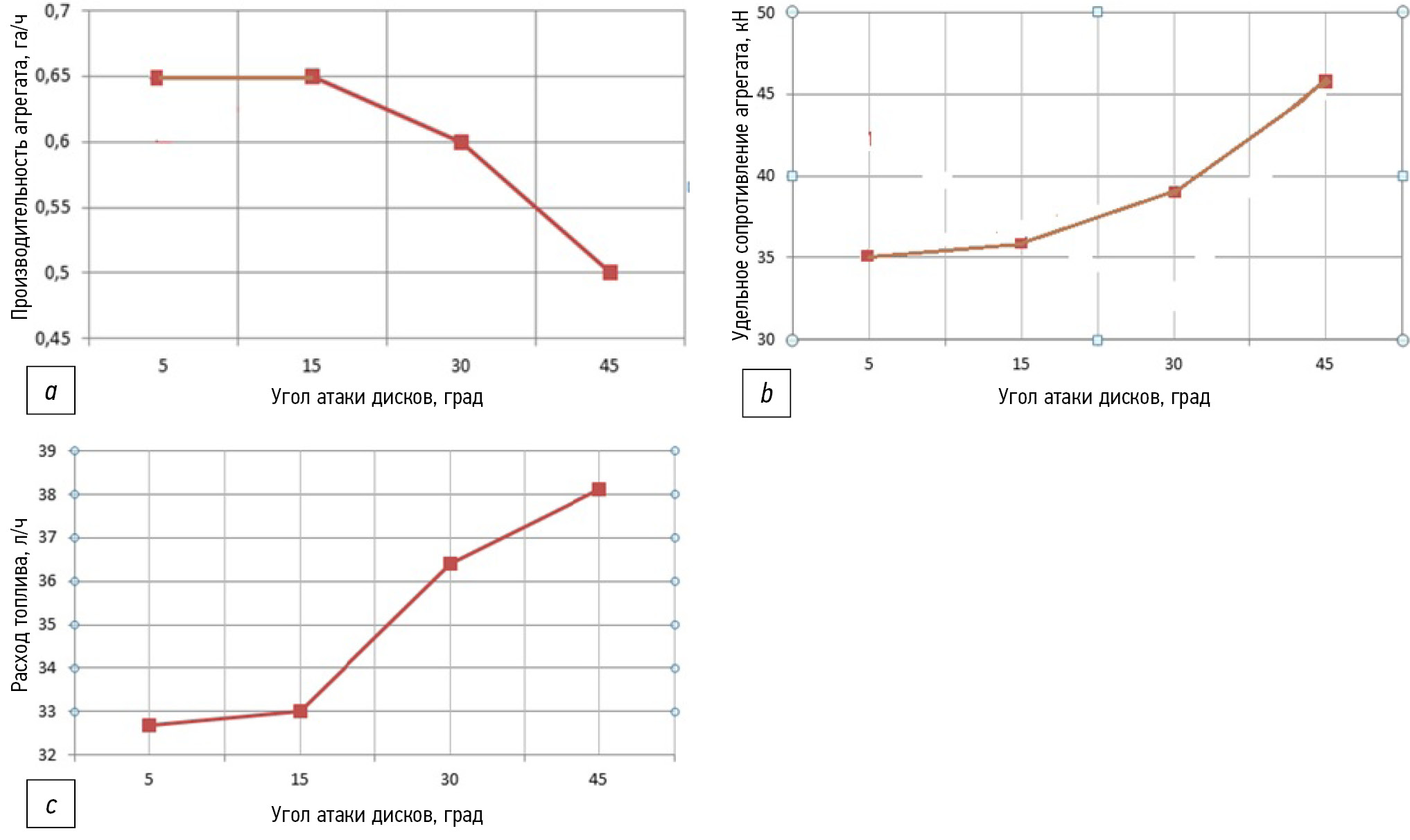 Рис. 6. Зависимости производительности (a), удельного сопротивления (b) и расхода топлива агрегата (c) от угла атаки дисков. / Fig. 6. Dependencies of productiveness (a), specific resistance (b) and unit’s fuel consumption (c) on the disk attack angle.