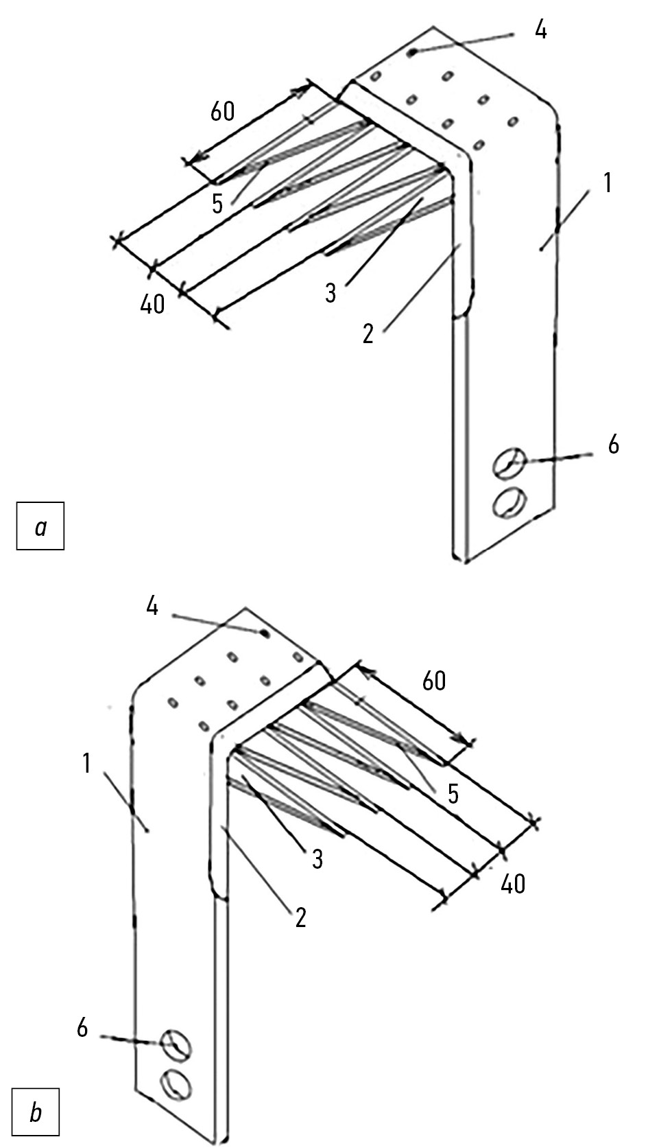 Рис. 1. Нож почвообрабатывающей фрезы с отогнутой частью стойки влево (a) и вправо (b) ): 1 — стойка с отогнутыми влево и вправо частями, 2 — режущая кромка, 3 — плоские кли- новидные зубья, 4 — монтажные кронштейны, 5 — режущая кромка, 6 — крепежные отверстия.