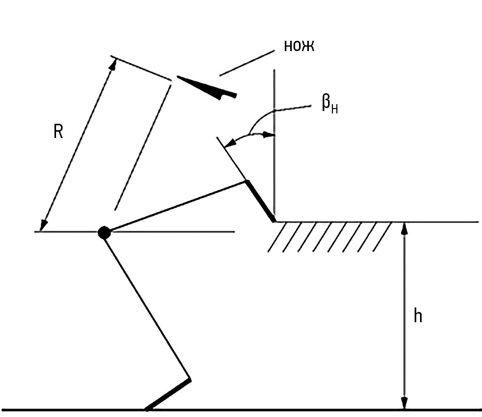Значение параметра вычисляем, спроектировав стойку на поверхность, перпендикулярную к направлению движения рабочего органа. Изменение фронтальной проекции в процессе резания будет зависеть от угла резания (рис. 5). Среднюю величину на дуге резания определим: