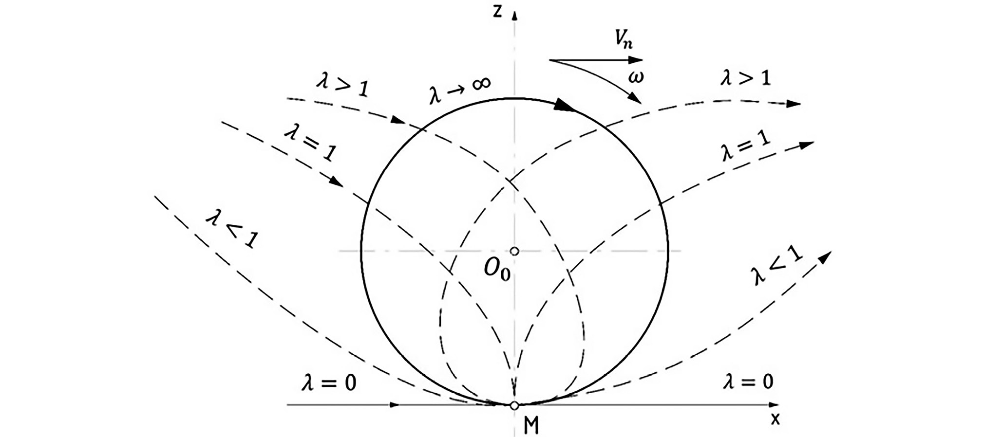 Рис. 4. Схема траектории движения точки ротора при различных кинематических параметрах λ.