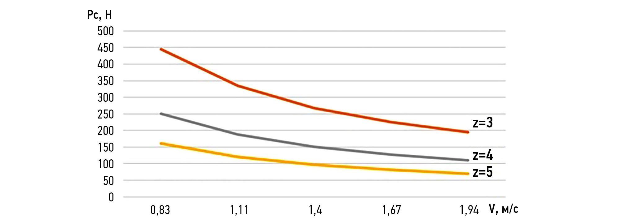 Анализируя теоретические зависимости влияния скорости перемещения и количества ножей в одной плоскости предлагаемого рабочего органа видно, что при трех ножах в одной плоскости рабочего органа, сопротивление, приходящееся на один нож увеличивается почти в два раза, что будет способствовать общему увеличению сопротивления почвы всему рабочему органу. В то же время, увеличение скорости передвижения оказывает положительный эффект на снижение реакции почвы на рабочий орган [8, 9].