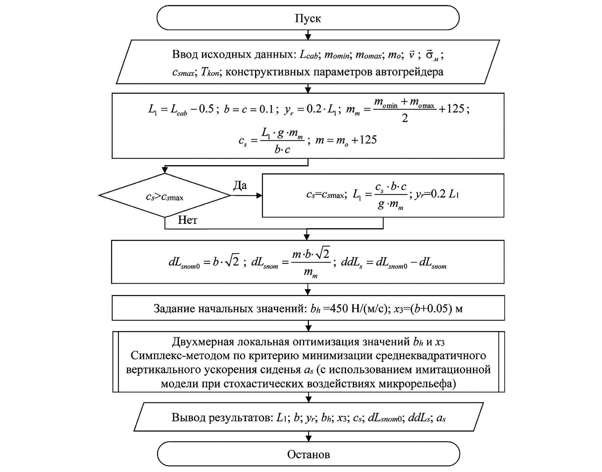 Оптимизация значений ряда конструктивных параметров виброзащитной системы сиденья проводится путем минимизации или максимизации в соответствии с применяемыми ограничениями. Максимальное значение коэффициента жесткости пружины целесообразно задать в качестве внутреннего ограничения в алгоритме методики. Оптимизация выполняется по критерию минимального среднеквадратичного вертикального ускорения сиденья в неподвижной системе координат as с помощью моделирования на имитационной модели перемещений автогрейдера с виброзащитной системой сиденья по заданному заказчиком тестовому набору стохастических микрорельефов.